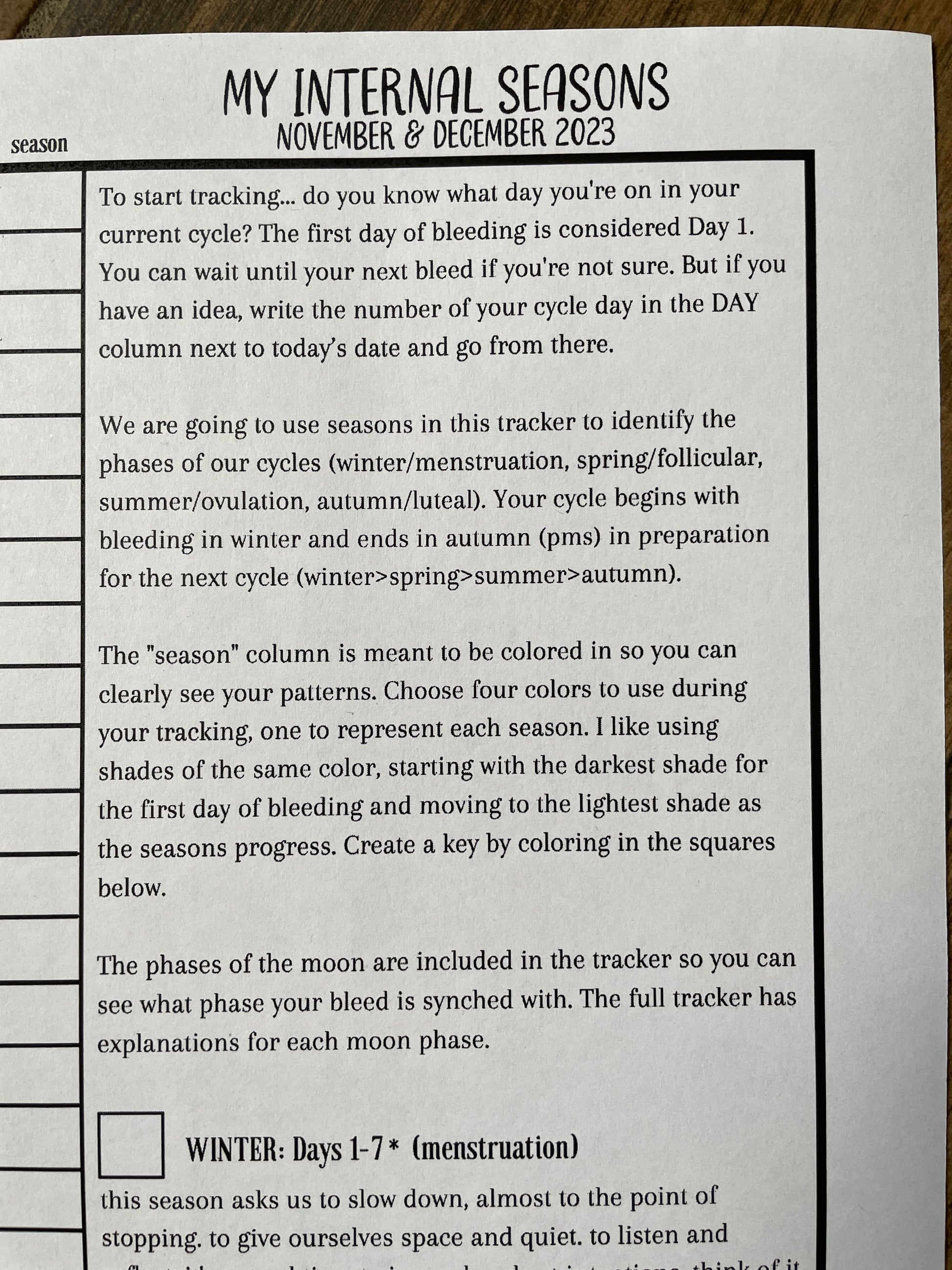 This tracker holds a whole year's worth of your cycle so you can see your very own ebbs and flows; you can see the cycles that live inside your body, all in one place, without having to flip pages. This tracker uses seasons (winter, spring, summer, fall) to identify the phase of your cycle, rather than the technical terms (menstrual, follicular, ovulation, luteal) because I think it helps paint the picture so much clearer to think of seasons and emotions, rather than phases and hormones.
