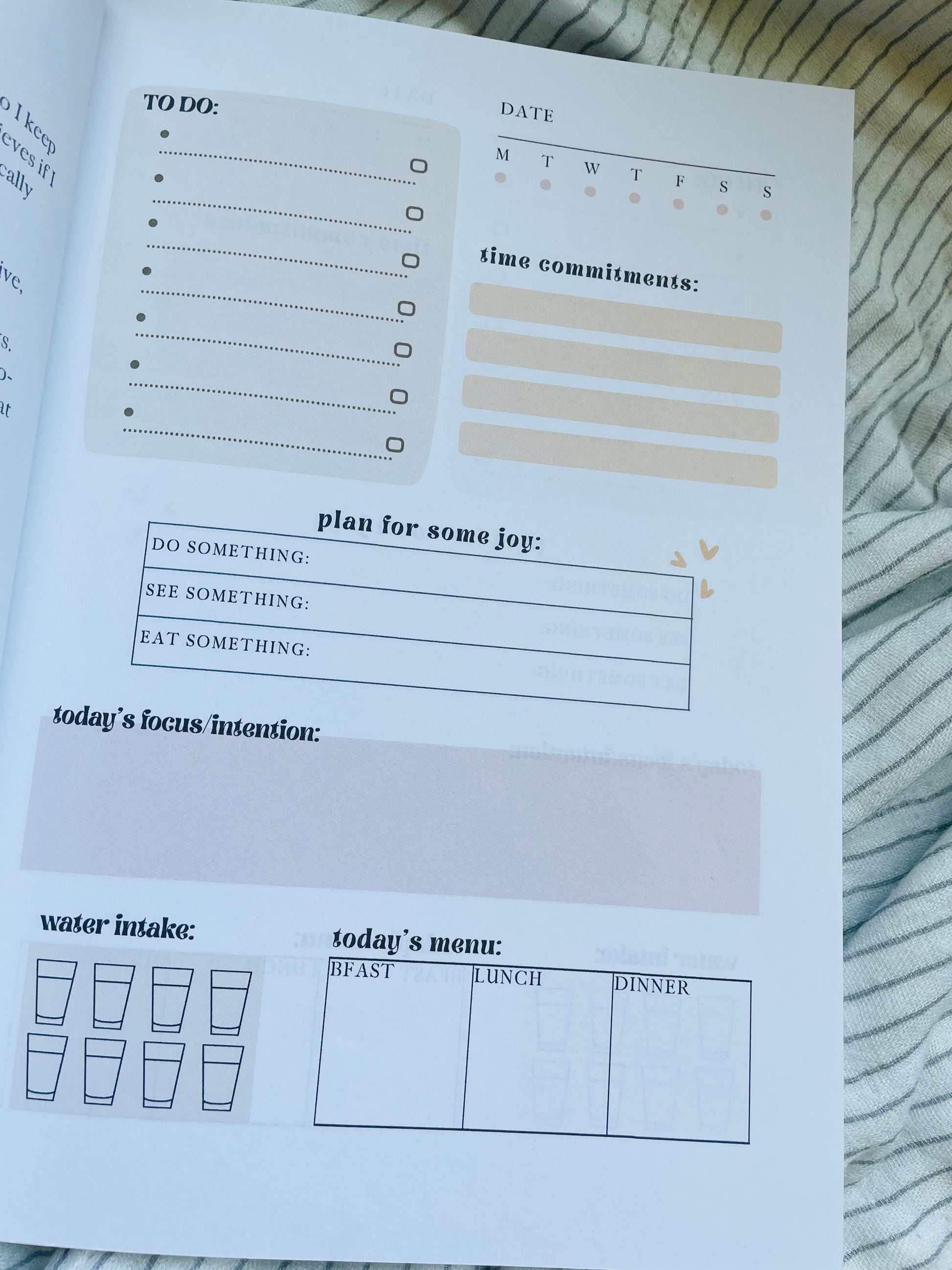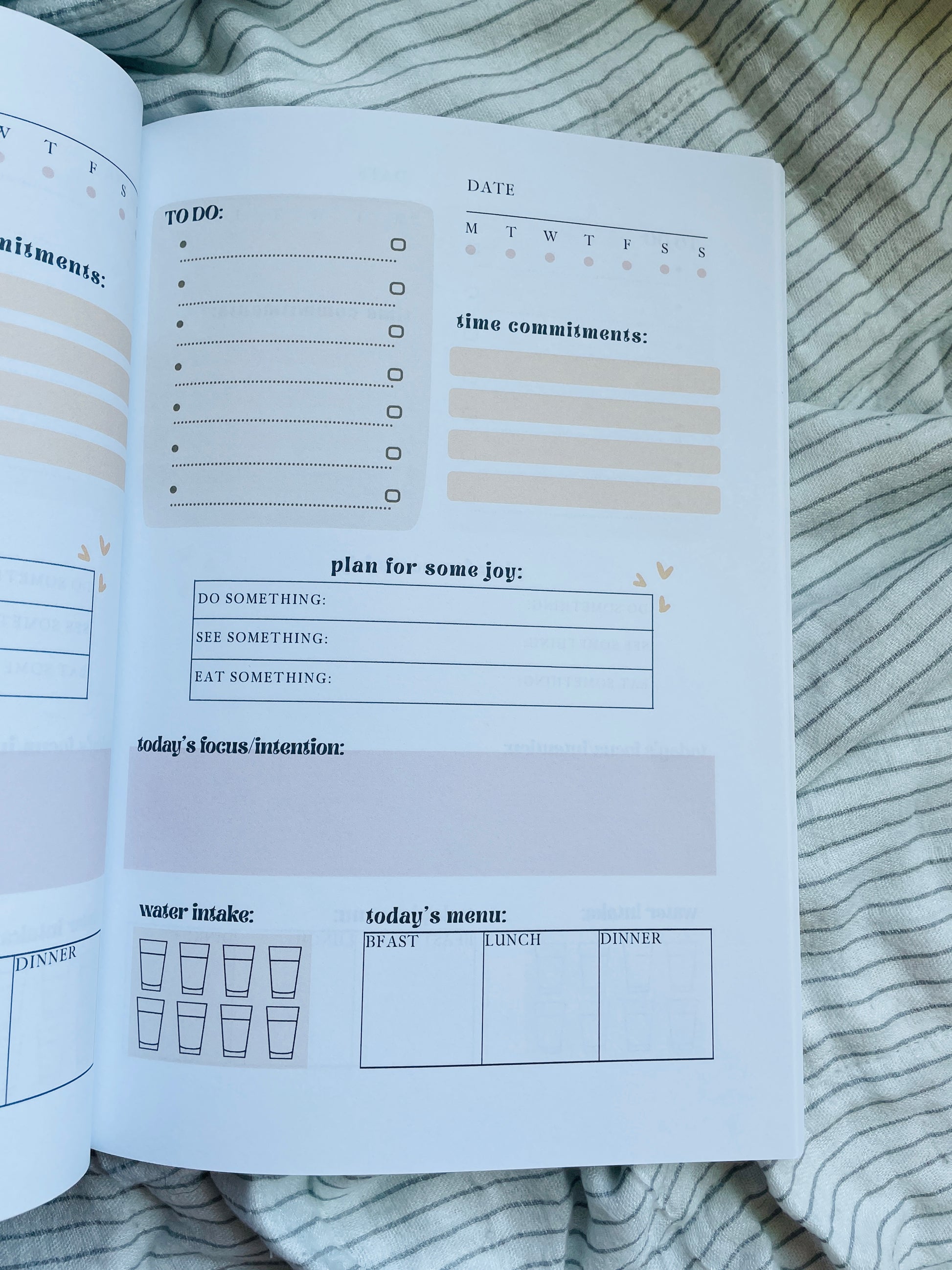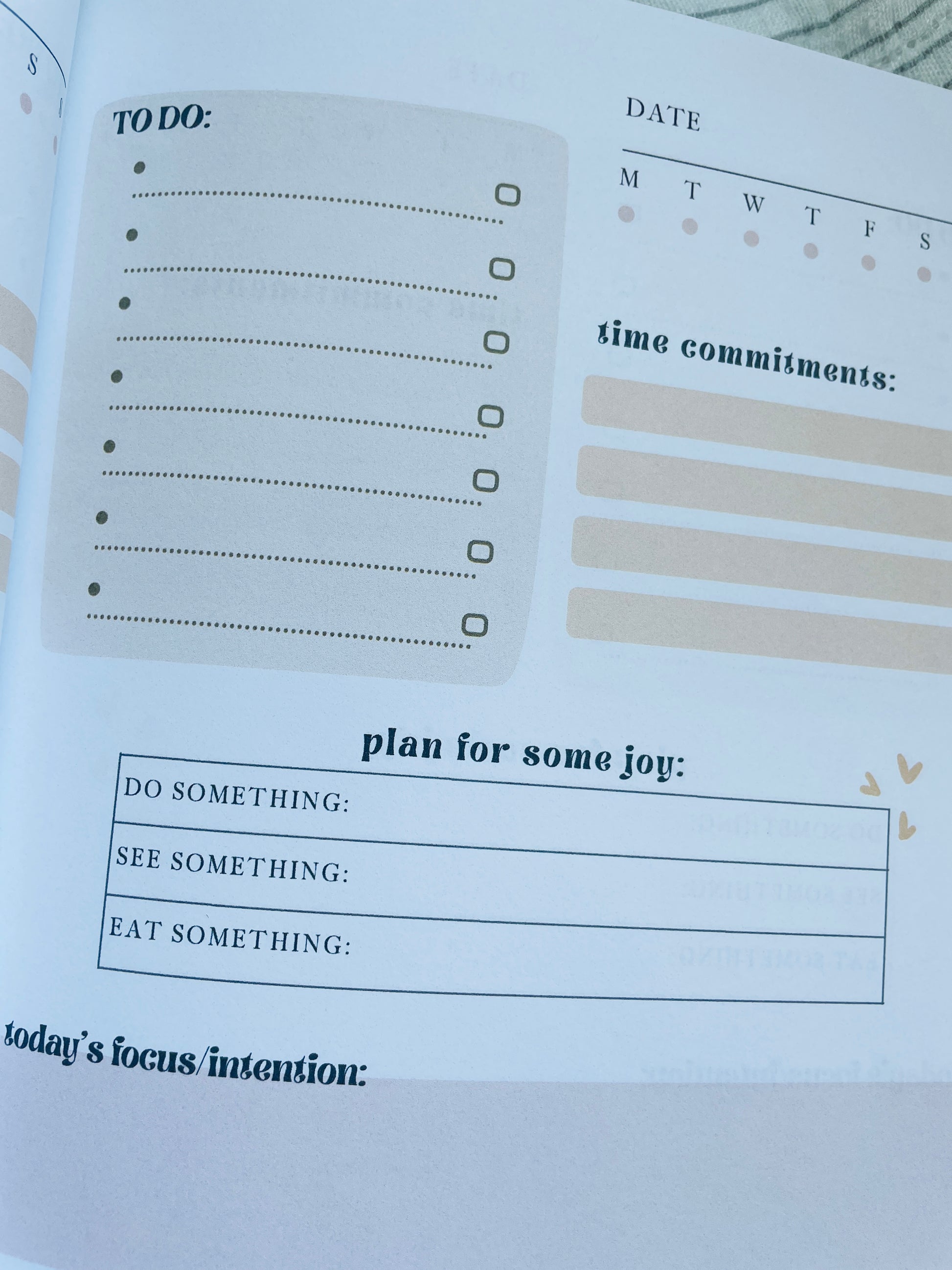 Plan for Joy: Every day has a dedicated space to plan for joy. Whether it’s something to do, something to eat, or something to see, this section helps you intentionally create moments of happiness. Alternatively, use it as a gratitude journal to reflect on joyful moments that unfolded throughout your day.